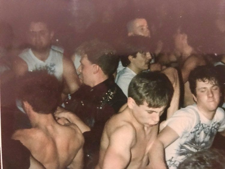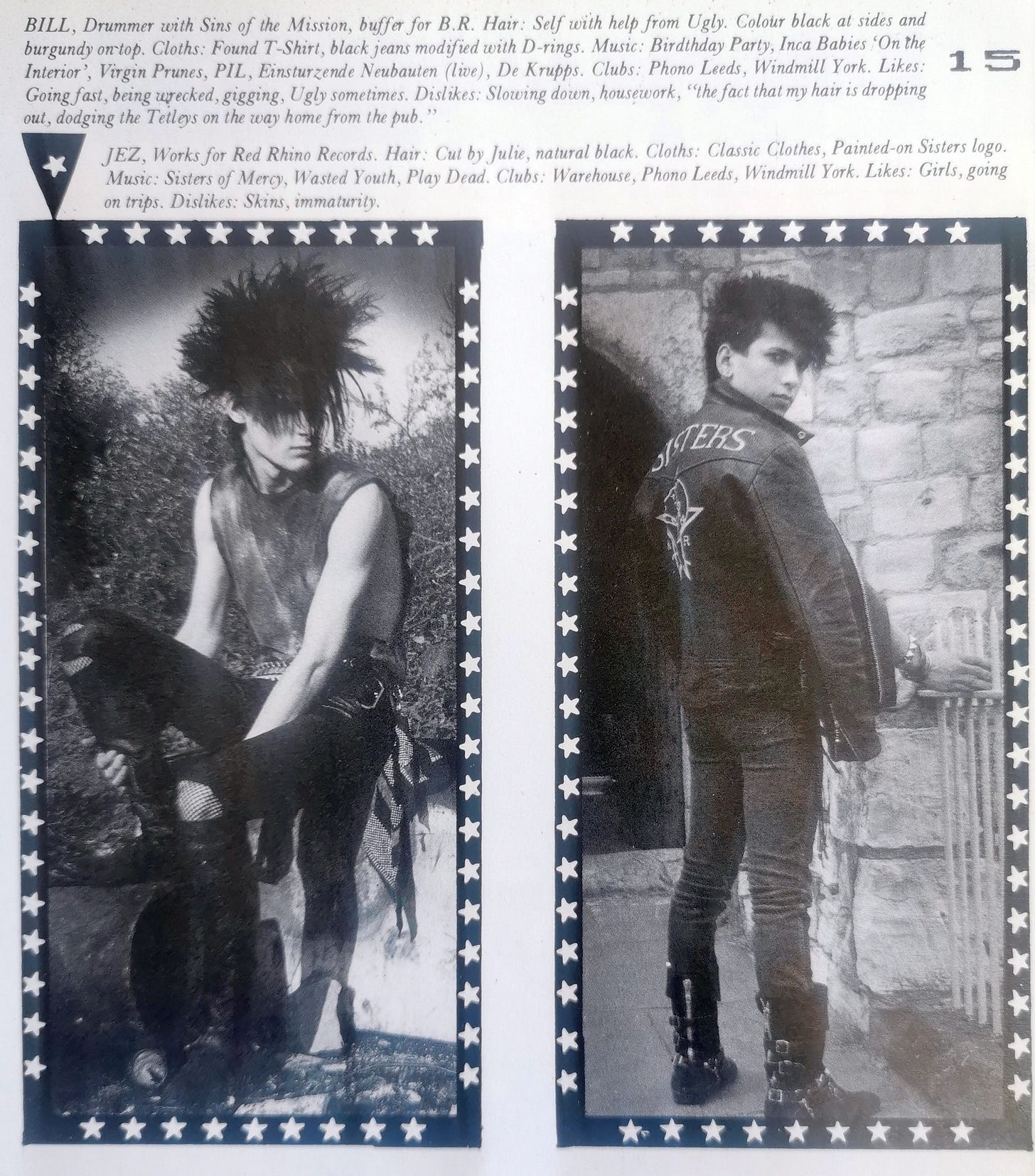 It was an odd time. Everything was transitional, amorphous, and ephemeral with no hard and fast demarcations. There was a long period when it was this hybrid or catch-all look – mutating punk meeting fleeing new romantic – tee shirts with radically cut off sleeves pulled down the rib cage, paired-up studded belts and wristbands, beaten up black drainpipe jeans. ‘Alternative’ club nights or DJ sets before and after gigs at places like Retford Porterhouse and Leeds Warehouse, a 1983 blend of early hip-hop, electro, Divine, Grace Jones, ‘Blue Monday’, Devo’s ‘Whip It’. These more post-punk-dance tracks were mixed with guttural and ‘gutter-al’ classics like The Cramps’ ‘Human Fly’ and Virgin Prunes’ ‘Baby Turns Blue’ where you could pose and preen, walk up and down and gesticulate awkwardly. The tempo would be raised with a bit of classic Theatre of Hate and Killing Joke’s ‘Eighties’, before the rowdy ‘chicken dance’ standards like The Birthday Party’s ‘Sonny’s Burning’ or Southern Death Cult’s ‘Fatman’ with their churning riffs resembling a tumultuous ocean prompted an explosion of limbs.